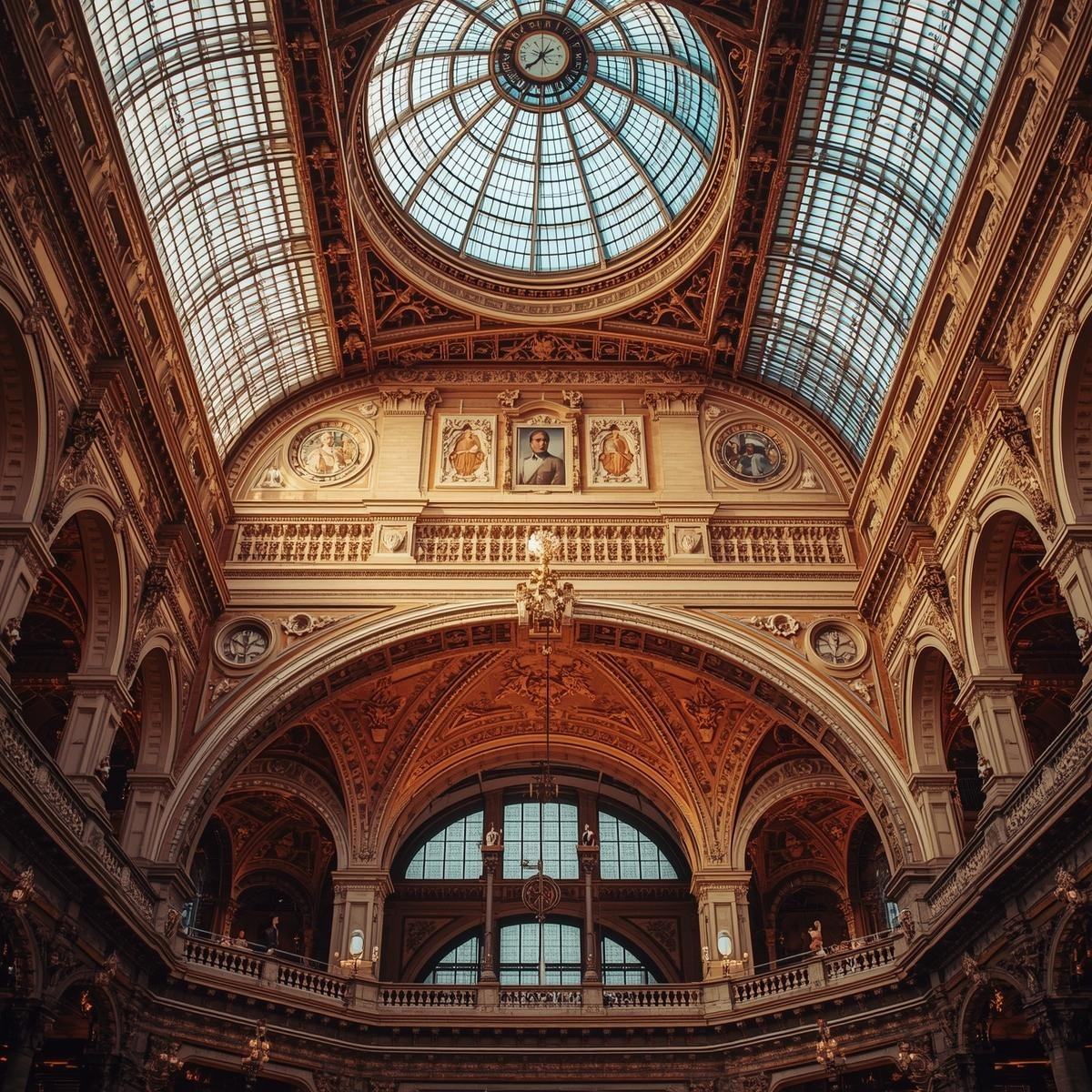 The structure’s grandeur is most visible in its ribbed copper roof over the dome and the gilded cupola above it, while a decorative glass and iron fanlight allows natural light to flood the historic entrance hall. The overall effect is one of barely contained excess, a building that seems always to be on the verge of becoming too much, and yet somehow never quite tips over into mere vulgarity.